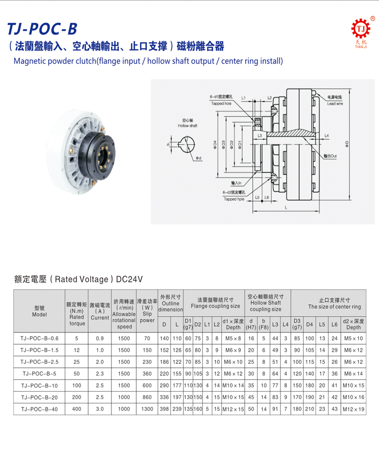 空心軸磁粉離合器(內(nèi)殼旋轉(zhuǎn)磁粉離合器)產(chǎn)品說明:TJ-POC-B磁粉離合器的工作原理與TJ-POC磁粉離合器系列的工作原理是一樣的。TJ-POC-B系列空心軸輸出磁粉離合器采用圈靜止,雖然采用的是自然冷卻方式,由于在輸入旋轉(zhuǎn)端的外周部配置了散熱片及動作面,自然冷卻效果好優(yōu)越性。它以磁粉為工作介質(zhì),以激磁電流為控制手段,達到控制制動或傳遞轉(zhuǎn)鉅的目的。其輸出轉(zhuǎn)鉅與激磁電流呈良好的線性關(guān)系而與轉(zhuǎn)速或滑差無關(guān),并具有響應速度快結(jié)構(gòu)簡單等優(yōu)點。