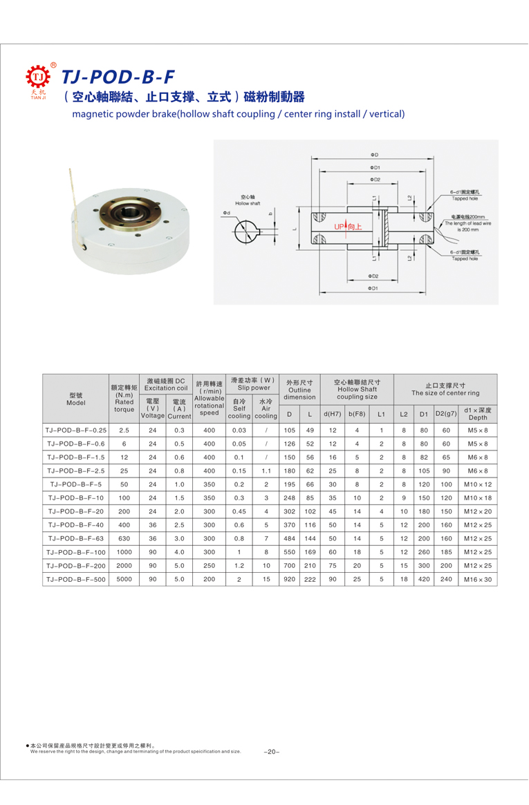 東莞天機傳動廠家生產的空心軸磁粉剎車器又稱立式磁粉剎車器是磁粉制動器中的一種??招妮S磁粉剎車器價格分為:TJ-POD-B-F、TJ-POD-B、TJ-POD-A、TJ-POD-B-E。這幾種型號的磁粉剎車器都為空心軸連接,立式止口支撐,使用的DC24V安全電壓。