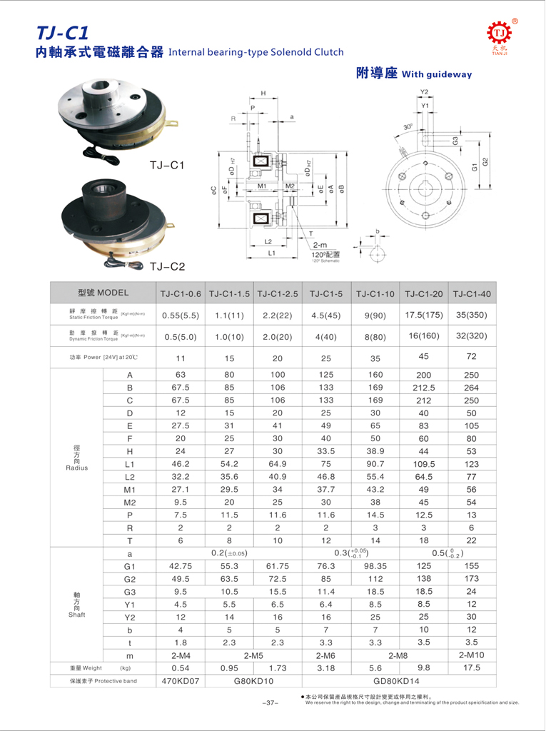 東莞天機傳動(臺灣天機牌)電磁離合器生產廠家制造銷售內軸承式電磁離合器(掛鉤式電磁離合器),對應的型號是TJ-C2,電磁離合器線圈通電時,在電磁力的作用下,將主動轉子與從動轉子連接在一起,主動端與從動端同時轉動,電磁離合器處于閉合的狀態。