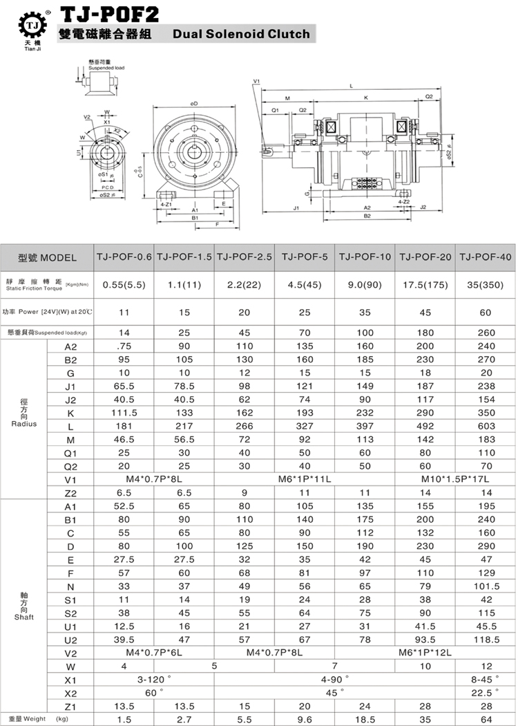 東莞天機傳動(臺灣天機牌)生產廠家銷售的POF2型雙電磁離合器組合體又稱軸式雙電磁離合器組合體,是由兩個電磁離合器組合而成。采用的進口原材料,臺灣生產加工技術,用的是DC24V直流電壓,產品通過ISO9001質量管理體系認證,質量放心可靠,讓客戶購買無憂。該POF2型雙電磁離合器組合體,軸式雙電磁離合器組合體結構非常獨特,安裝也極為簡便。緊湊的貫通軸結構,即兩個電磁離合器都裝置在同軸上,極其的合理配置產著各種部件,是一種極其獨特的組合,適用于正反轉、變速、動力分配、連接、切離、高速運轉等多用途。可實現多種功能,由此機型可實現二級變速、高頻度正反轉等復雜并且高精度的控制等多種功能,同時可以實現傳遞機構的簡單化,安裝和使用都極為簡便,耐用、實用。