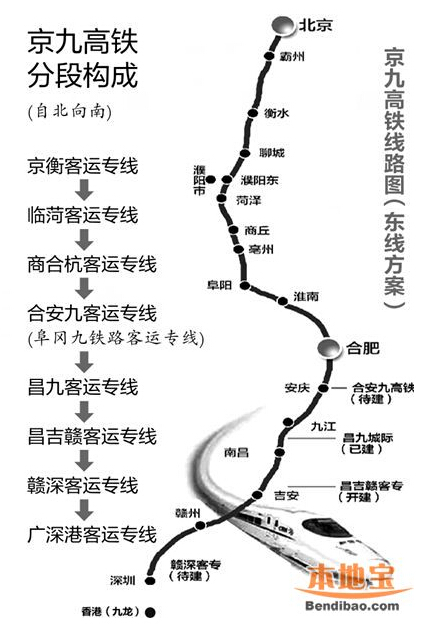 京九高鐵又稱京九客運(yùn)專線,線路全長2000公里,設(shè)計(jì)時(shí)速為350公里,北起北京,跨越京、冀、魯、豫、皖、贛、粵七個(gè)省級行政區(qū),南至深圳,連接香港九龍,是連接環(huán)渤海和珠三角的重要高速鐵路干線。途徑北京、霸州、任丘、河間、衡水、清河(邢臺)、臨清、聊城、臺前(濮陽)、梁山(濟(jì)寧)、菏澤、商丘、亳州、阜陽、淮南、合肥、安慶、九江、南昌、吉安、贛州、河源、惠州、深圳,最后到達(dá)香港九龍。主要由北京至衡水客專(京霸段預(yù)計(jì)2019年建成)、臨菏客專(臨清—菏澤)、商合杭高鐵(商丘到合肥段已經(jīng)建設(shè))、合安九客運(yùn)專線(阜陽到九江段),昌九客運(yùn)專線(九江—南昌)、昌贛客運(yùn)專線(南昌—贛州)和贛深客運(yùn)專線(贛州—深圳)和廣深港客運(yùn)專線(深圳—九龍)接駁而成。京九高鐵商丘以南段將先期建成通車,待北京到商丘段的規(guī)劃建設(shè)完成,京九高鐵將逐步形成。本專題將為您介紹2015京九高鐵最新消息和京九高鐵通車時(shí)間,幫助您了解最新資訊,方便你的出行。